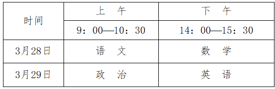 文化考试由教育部教育考试院和省级招生考试机构参照普通高考有关规定组织实施。文化考试科目为语文、数学、政治、英语四科,每科满分为150分,四科满分为600分,使用国家通用语言文字作答。考生于2026年3月28、29日按时参加普通高考报名所在地省级招生考试机构组织的文化考试。